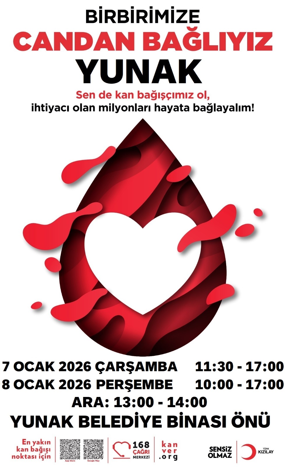 Hayat kurtarmanın en anlamlı yollarından biri olan kan bağışı için tüm hemşehrilerimizi davet ediyorum.Bir ünite kan, birden fazla hayata umut olur. ❤️ Yer: Yunak Belediye Binası Önü7 Ocak Çarşamba: 11.30 – 17.008 Ocak Perşembe: 10.00 – ...