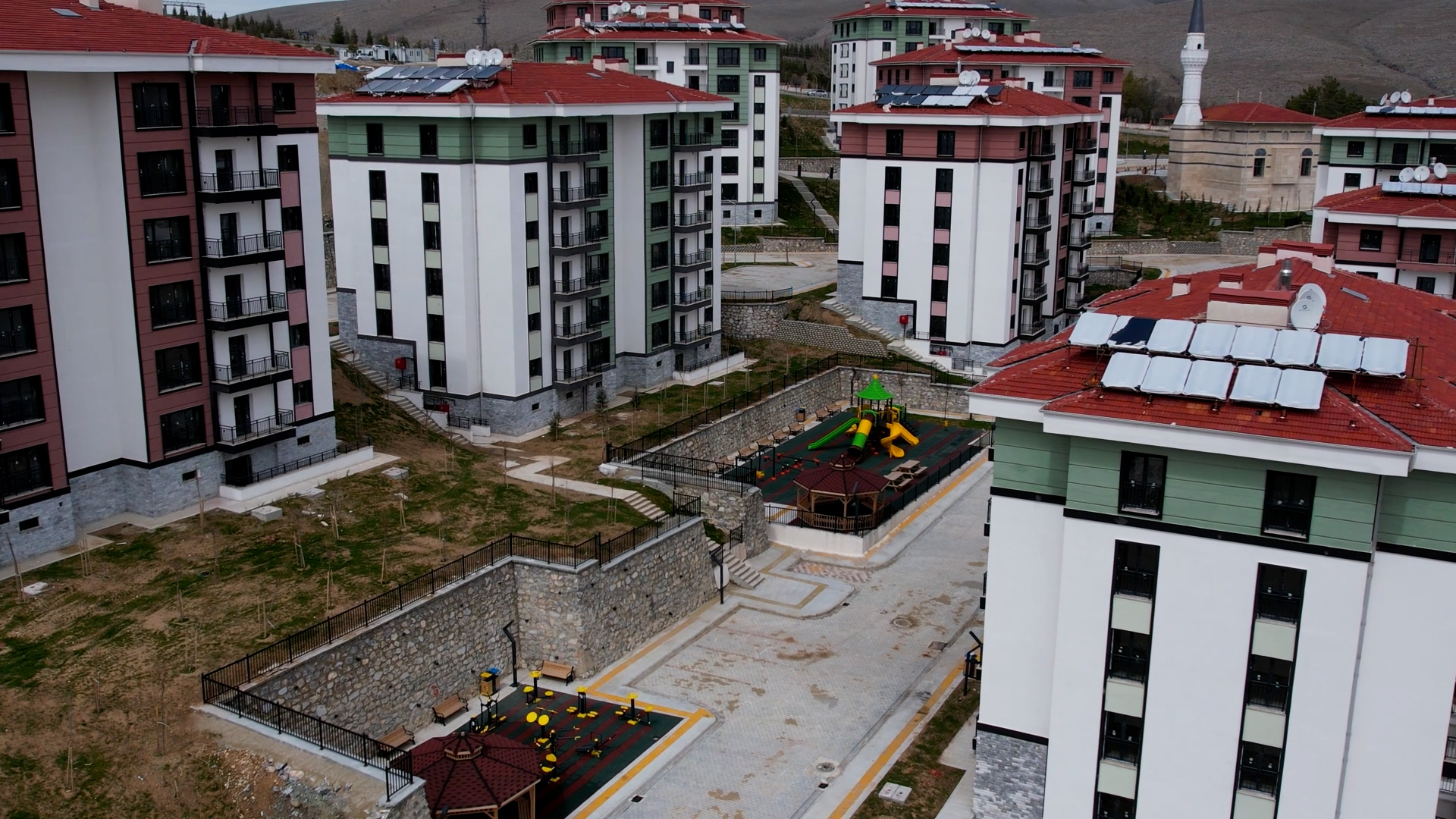 Yatay mimari anlayışıyla yapılan konutlar; radye temel üzerine, tünel kalıp sistemi ile depreme dayanıklı olarak inşa edildi.